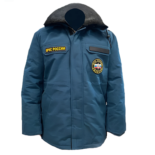 Куртка зимняя МЧС — удлиненная с отстегивающимся капюшоном и съемным воротником из искусственного меха, с центральной застежкой на тесьму-молнию, прикрытую ветрозащитным клапаном, двумя верхними прорезными карманами с клапаном и нижними прорезными карманами. По линии талии утеплённая куртка стянута тесьмой-кулиской, рукав длинный втачной с внутренним трикотажным манжетом.